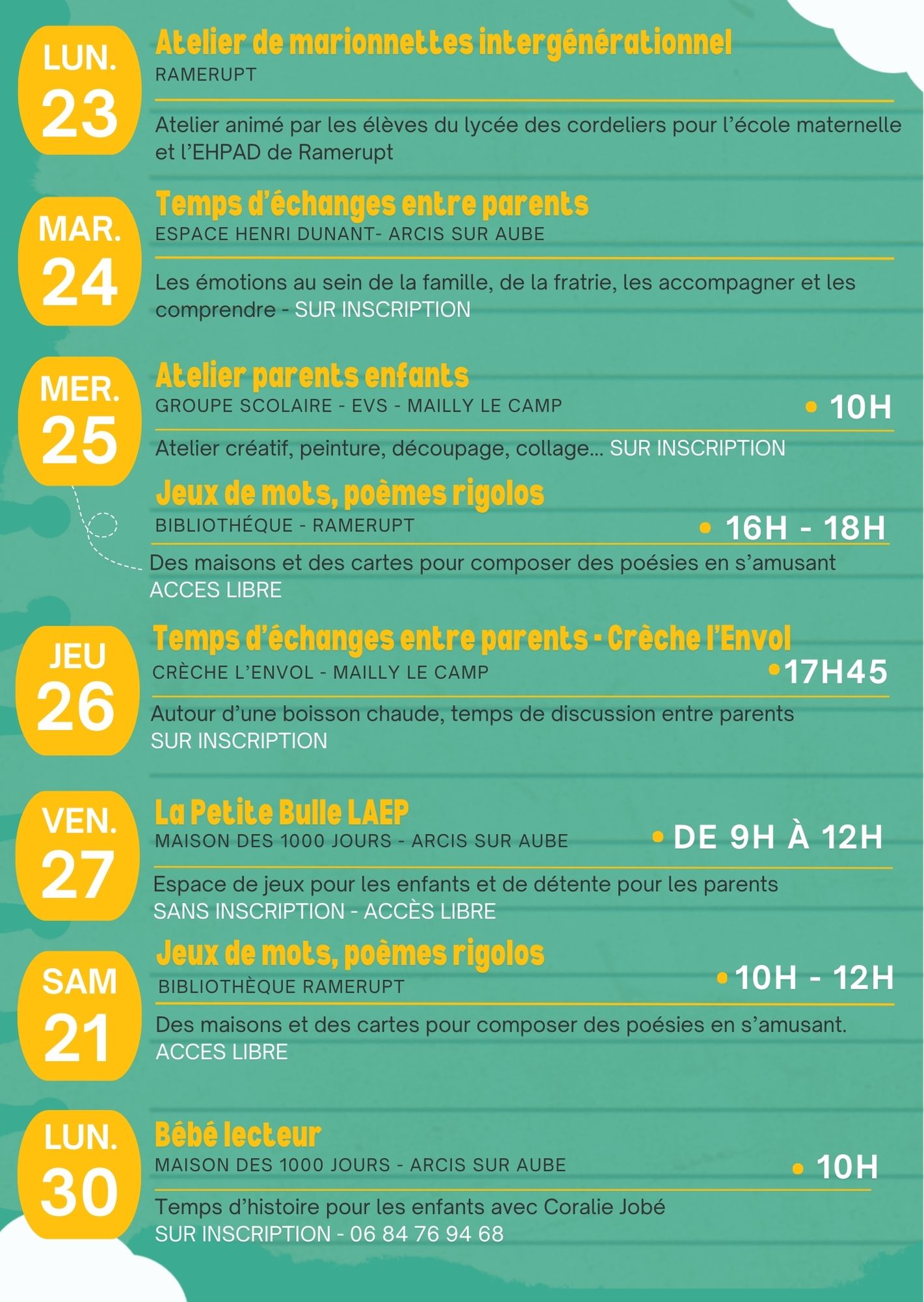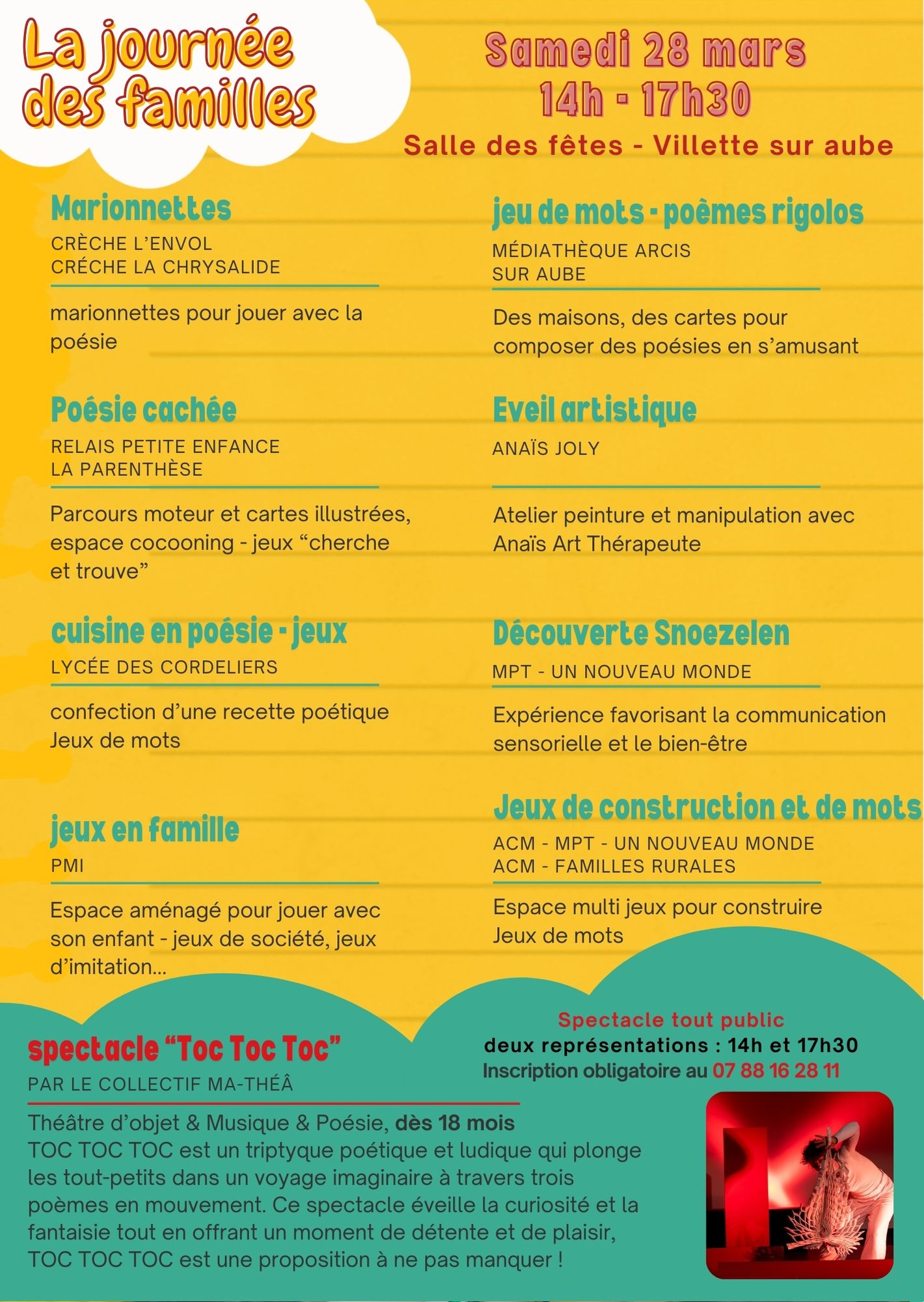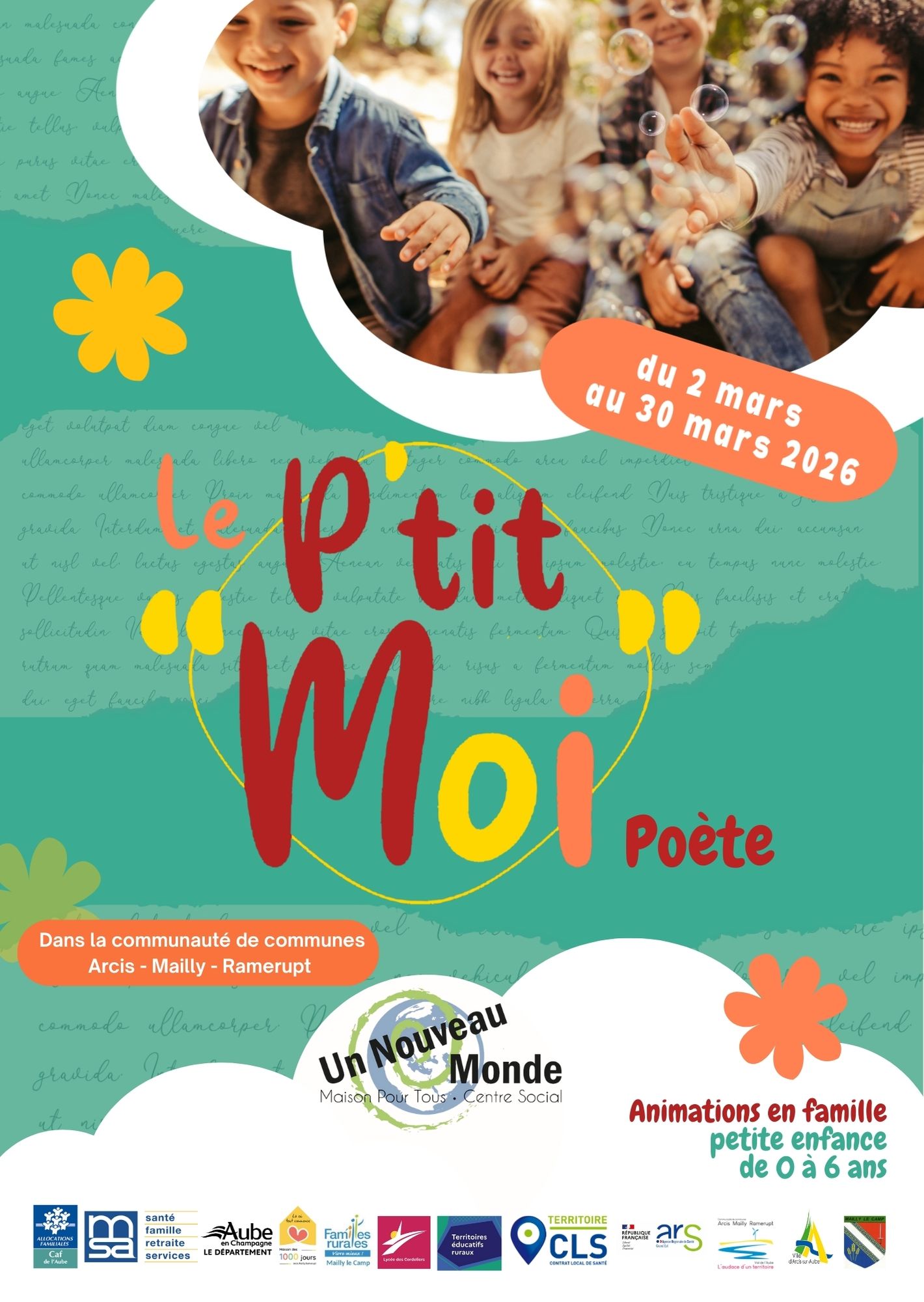 Un mois d’animations pour les familles et les professionnels avec des enfants de la naissance à 6 ans, avec le 28 mars, un après-midi multi ateliers à la salle des fêtes de Villette sur Aube.